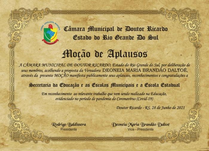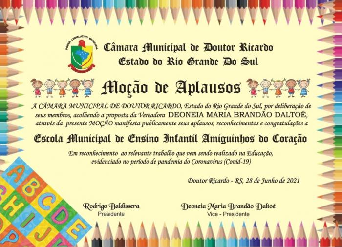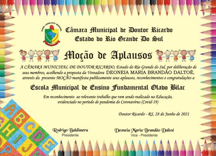 MOÇÃO de Congratulações e Aplausos a todos os Professores, Educadores, Servidores das Escolas e Creches do Município de Doutor RicardoSENHOR PRESIDENTE,SENHORES VEREADORES E VEREADORAS,REQUEIRO à Mesa na forma regimental de estilo e após ouvido o Douto Plenário que seja consignada em Ata de Nossos Trabalhos Moção de Congratulações e Aplausos a todos os Professores, Educadores, Servidores das Escolas e Creches do Município de Doutor RicardoA honraria abrange os coordenadores, diretores, supervisores, assessores, professores, equipe pedagógica, bem como os demais trabalhadores que integram a Educação Municipal e Estadual de ensino do Município. Mesmo com a suspensão das aulas presenciais, os servidores têm atendido os estudantes com distribuição de kit alimentar e de material escolar, além de preparação de aula por meio de vídeo e orientação.Vale mencionar, que o trabalho exercido pelos professores, coordenadores, diretores e vice-diretores, tem sido prestado com dedicação, aprimoramento, amor, alegria, e prazer em servir nossos alunos.Com o isolamento social inesperado e a necessidade de reestruturar o planejamento pedagógico, estes profissionais tiveram que se reinventar, buscando diariamente, novas formas e possibilidades, trabalhando incansavelmente para propor um ensino de qualidade e manter os estudantes engajados nas novas propostas.É preciso reconhecer a importância desses servidores Municipais e Estaduais, da área da Educação nesse momento ímpar e sem precedentes da humanidade, que prestam um bom atendimento aos nossos munícipes. Não podemos deixar de destacar e valorizar a dedicação e o desempenho desses profissionais que, a cada dia, desempenham com muita eficiência o trabalho junto a comunidade.Mesmo com as aulas presenciais suspensas, as escolas municipais iniciaram o ano letivo de 2021 no dia 17 de fevereiro, onde a Secretaria de educação entregou atividades domiciliares nas casas de todos os alunos. No dia 03 de março iniciaram as aulas presenciais para alunos da pré-escola e todos os anos do Ensino Fundamental de forma híbrida, aulas dia sim e dia não. Os alunos com idade creche iniciaram no dia 17 de maio, um turno, sendo alguns no turno da manhã e alguns no turno da tarde, pois é necessário cumprir os protocolos de distanciamento e não temos estrutura física para atendermos a todos os alunos em um turno somente. Alguns pais de alunos não assinaram o termo de corresponsabilidade que autoriza e permite o aluno a frequentar a escola, por isso não retornaram às aulas presencias, sendo direito dos pais. Porém, os pais que não autorizaram seus filhos retornarem às aulas presencias devem ir até a escola para retirar as atividades que devem ser realizadas em casa a fim de cumprir as tarefas solicitadas.As atividades domiciliares eram/são entregues em envelopes contendo atividades impressas e alguns materiais que são necessários para realizar algumas atividades, principalmente alunos da EMEI Amiguinhos do Coração. Os kits alimentação foram entregues para alunos que não estão frequentando a escola, mas foi só um kit por aluno, durante o primeiro semestre foi consultado o Conselho de Alimentação escolar para realizar esta ação.E assim, primamos pelas aulas presenciais e gostaríamos que todos os alunos frequentassem a escola, quem está na escola aprende mais, recebe dois lanches por turno e se envolve mais com as atividades da escola, e do município, por isso estamos fazendo todo esforço possível para continuar as aulas e quando for possível, ofertar aulas todos os dias.Requeiro, outrossim, que o decidido por esta Casa de Leis seja oficiado a Secretaria de Educação, as Equipes Diretivas de todas as Escolas de Ensino do município: Escola Municipal de Ensino Infantil Amiguinhos do Coração, Escola Municipal de Ensino Fundamental Olavo Bilac EEEM - Escola Estadual de Ensino Médio Doutor Ricardo DEONEIA MARIA BRANDÃO DALTOÉVEREADORA/ Vice Presidente