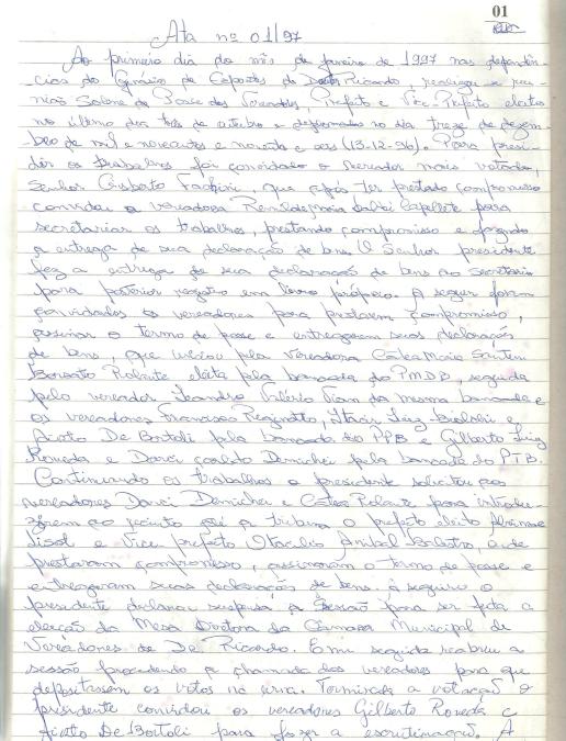 Primeira Sessão Solene, realizada no Município de Doutor Ricardo, ocorreu no primeiro dia do mês de janeiro do ano de mil novecentos e noventa e sete, Posse dos Vereadores, Prefeito e Vice- Prefeito do Município de Doutor Ricardo – RS. Dando inicio a Sessão Solene, foi convidado para presidir os trabalhos o Vereador mais votado Sr. Gilberto Faccini. O Legislativo é responsável pela aprovação dos projetos de leis nas áreas da Saúde, Educação, Habitação e Meio Ambiente, Esportes, Políticas para a juventude entre outros, aos quais são direcionadas ao setor Executivo a fim de atender as necessidades da Comunidade Ricardense.